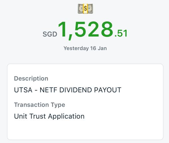 Feeling really happy with my investing journey and the results so far! 🎉 Just two days ago, I received a dividend payout of SGD 1,528 from my Unit Trust investments—my single largest payout yet! This marks another step in building my portfolio, and seeing these results keeps me inspired to stay consistent.